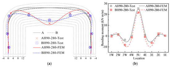 The calculated bending moment of Structures A and B in the critical construction stage was compared with the measured values, as shown in Figure 13b. It can be seen from Figure 13b that the bending moment calculated by the FEM is consistent with the measured values. The calculated bending moment in the middle of the sidewall at the end of stage 2 is slightly smaller than the measured value. The haunch bending moment of Structures A and B at the end of stage 3 calculated by the FEM is slightly larger than the measured value, but the difference is within 11%. The crown bending moment is relatively close.