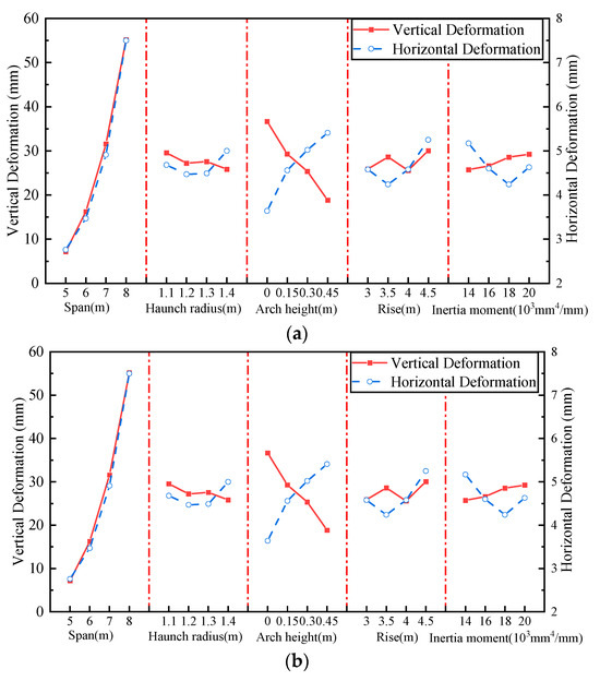 It can be seen from Figure 15 that the most influential factor on the crown and haunch bending moment is the span of the structure, followed by the arch height. The bending moment and deformation increase with the increase in the span. With the increase in the arch height, the bending moment of the structure under the dead load and live load decreases linearly, and the crown vertical deformation is significantly reduced, and the horizontal deformation of the structure is significantly increased. The soil–steel interaction is exerted. The effect of span and arch height on the bending moment under the live load is more significant. The sensitivity of the bending moment to inertia moment is lower than the above two factors but significantly higher than rise and haunch radii. The increase in inertia moment makes the CSP bear more loads, and the soil–structure interaction decreases. The haunch and crown bending moments increase with the increase in the inertia moment. Rise and haunch radii have less influence on the deformation and bending moment.