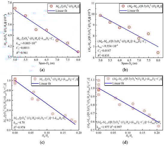 Factors such as the ratio of the haunch radius to the crown radius and the ratio of the span to the haunch radius were added to Equation (1), as shown in Equation (8). When the crown of the structure is straight, and in Equation (8) are 1, and the factors , , , and can be firstly fitted. In order to have more samples to fit the factors, more FEMs were established based on the above parameter analysis. The relationship between the ratio of the bending moment when the backfill reaches the minimum height of the cover (0.3 m) to and the span is shown in Figure 16a. and obtained by linear fitting are −9.005 × 10−5 and 0.0011, respectively. The relationship between the ratio of the bending moment generated in backfilling the remaining part to and the span is shown in Figure 16b. and obtained by linear fitting are −9.554 × 10−4 and 0.0147, respectively. After the factors , , , and were fitted, the and were linearly fitted as shown in Figure 16c,d. and are 4.70 and 1.977, respectively. It can be seen from Figure 16 that the fitting errors of , , , and are within 5%. The fitting error of and is slightly larger, about 16.5%.