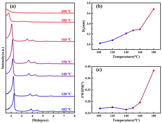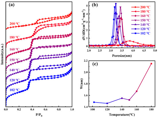 Figure 1a shows SAXD patterns of the samples subjected to different hydrothermal crystallization temperatures, the details of which are outlined in Table 1. As the temperature increases, the (100) crystal plane spacing of MCM−41 continuously expands, signifying ongoing lattice expansion. Notably, above 180 °C, the diffraction peaks of the material disappear rapidly. From the change in pore size of the material shown in Figure 1b, as the temperature increases, the pore size also gradually becomes larger. The half-width variations of the small-angle X-ray (100) diffraction peaks at different temperatures, as depicted in Figure 1c, allow us to approximate the specific changes in structural orderliness, a higher half-width indicates poorer orderliness. Between 100–160 °C, the orderliness remains relatively stable, but it sharply declines upon reaching 180 °C, and the material loses order completely when the temperature continues to rise to 200 °C. Similar diffraction peak disappearance phenomena have been observed by other researchers in studies related to MCM−41’s properties [28,29].