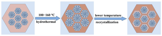 The SAXD results (Figure S3b) reveal no significant changes in the (100) plane spacings of the materials. This is attributed to micelle contraction, which does not alter the precipitation–dissolution equilibrium of silica at the interface. As a result, the lattice movement is halted. The addition of 4 mL of water glass introduces a substantial number of oligomeric silicates, which condense in the gaps between the pore wall interface and micelles. Due to the mismatch in size between the pore walls and the contracting micelles inside, the condensed precipitated silica cannot be uniformly distributed on the surface of the pore walls. This results in reduced orderliness of the pore channel arrangement after secondary crystallization, as evidenced in the SAXD spectra by a decrease in diffraction peak intensity and an increase in half-peak width. The surface area and mesopore analysis results of the three samples, as shown, indicate a slight increase in pore size after secondary hydrothermal treatment at 100 °C. This is due to the reduced protective effect of the micelles on the mesoporous channel interface after contraction, akin to the changes observed in MCM−41 materials post-surfactant removal and hydrothermal treatment [28]. The silica at the pore wall interface dissolves. The material with 4 mL of added water glass shows a significant reduction in pore size to 3.20 nm, almost equal to the pore size obtained by direct hydrothermal synthesis at 100 °C. These results conclusively demonstrate that the enlargement of MCM−41 material pore size with increasing hydrothermal temperature is due to the thermal expansion of micelles from low to high temperatures, and this expansion is reversible, with micelles contracting from high to low temperatures. The effect of the above thermal expansion of micelles at lower temperatures on MCM−41 can be illustrated in schematic Figure 5.