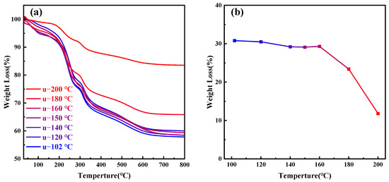 As the temperature continues to rise above 180 °C, the orderliness of MCM−41 materials significantly decreases; at 200 °C, it completely loses its orderliness, indicating that CTAB molecules cannot aggregate to form a two-dimensional hexagonal liquid crystal phase at 200 °C. Figure 6a presents the thermogravimetric analysis of MCM−41 samples synthesized but uncalcined at different hydrothermal crystallization temperatures, while Figure 6b depicts the weight loss percentage of the materials between 200–550 °C, indicative of the CTAB content. The primary weight loss components from room temperature to 200 °C are adsorbed and bound water in the material, while post 550 °C, the main weight loss is due to water produced from the condensation of silanol groups [26]. It is evident that post 180 °C, the CTAB content in the material significantly decreases. Other researchers have also observed comparable experimental results, with the proportion of silica in synthesized MCM−41 materials gradually increasing with temperature [28,44]. Since the total amount of silica source added to the solution remains constant, the quantity of silica in MCM−41 materials is fixed, with only the degree of silica condensation varying. Therefore, the reduction in CTAB content is due to its dissolution from the mesoporous channels, failing to serve as an ordered template for silica, ultimately leading to the loss of material orderliness.