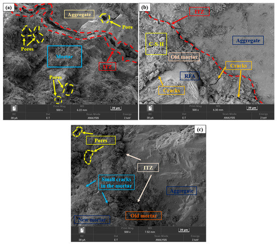 The SEM images featured in Figure 8 portray the microstructural integrity of C-RFC at different C-RFA replacement rates. The findings showed that the pore structure in mortar, the ITZ width, and the number of micro-cracks in C-RFC were proportional to the level of C-RFA content.