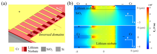 In our experiment, we designed an x-cut PPLNOI construction that adequately covers the nonlinear processes of S, C, and L bands (~100 nm bandwidth) for telecommunication applications. The electrode configuration of x-cut LNOI in our work is shown in Figure 2a. Since the domain inversion nucleates from the +z-axis [20], we used a comb-like positive electrode arranged in a periodic pattern on the +z side whose period is chosen in the 4 ~ 5.5 μm range, and a flat negative electrode on the −z side. The lengths of the positive electrode comb teeth are set as 20 μm, with the comb width about 1/5 of the period at a submicron level. The gap between the comb teeth tips of the positive electrode and the negative electrode is 6 μm. These shape parameters have been empirically examined as optimal for period poling on LNOI. The electrode layer consists of 40 nm thick Cr and 30 nm thick Au deposited on thin-film LiNbO3, which can ensure a considerable nucleation rate and sufficient material adhesion with the LiNbO3 thin film. The electric field simulation diagram for this configuration with a 600 nm thick LiNbO3 thin film is illustrated in Figure 2b. The electric field magnitude is greater than the minimum coercive field for switching across the poling area in both the x-z and y-z cross-section profiles, especially near the positive electrode. It is evident that this design of electrodes meets the requirements of poling electric field for domain reversal in entire thin-film LiNbO3.