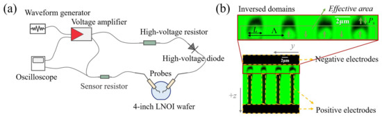 The domain inversion was fabricated by high-voltage electric field poling introduced in Section 2.2. The wafer with the electrode layer was connected to the circuit shown in Figure 3a by a pair of probes. In order to prevent air breakdown caused by high electric field strength, a thin layer of silicone oil was dropped onto the electrode surface before poling. The voltage amplifier (Aigtek ATA-7020) amplifies the preset pulse generated from the arbitrary waveform generator (AWG) (Rigol DG4062) as the input of the circuit. We monitored both the amplified pulse signal and poling current as feedback in real time with an oscilloscope (Tektronix TDS 2024C). A high-voltage resistor and a diode were connected in series in the loop to protect the circuit against high current and backflow.