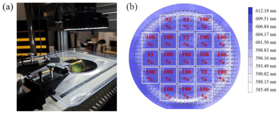 From the zoomed-out view, our experiment was conducted on a 4-inch wafer, and an efficient poling process was carried out based on the above-mentioned experimental design and methods. Figure 6a shows a photograph during poling. The positive and negative probes are contacted with the corresponding electrodes in each group. The wafer in our experiment was preset into 21 blocks labeled in Figure 6b, and the high-quality rate of each block with an area of 1.5 × 1.5 cm2 is summarized. The background is a thickness fluctuation map of thin-film LiNbO3 from NANOLN. We have achieved a 100% poling success rate of periods in the range of 4.38~5.51 μm and higher than 90% high-quality rate in each block, averaging an overall 98% high-quality rate. The electrode design and poling process in our work are proven to perform with high stability and uniformity on the entire 4-inch wafer scale and have a certain degree of insensitivity to variation in thickness. In the blocks that do not reach a 100% high-quality rate, a small part of the periodically poled domains have been fabricated with duty cycles outside the 50 ± 5% range but inside the 40~70% range. We conject such deviation as the initial parameters testing and slight changes in the conductivity of the poling electrodes. This deviation in the duty cycle does not cause a shift in the nonlinear conversion spectrum but simply has a small impact on the conversion efficiency [52], which can be finer poled locally after feedback from confocal second-harmonic microscopy.