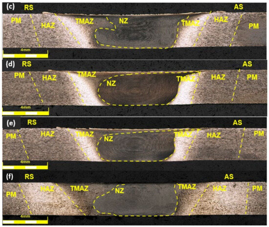 Figure 4, and the welding parameters for each micrograph were: (a), (b)—750 rpm and 200 mm/min; (c), (d)—1040 rpm and 143 mm/min; and (e), (f)—1500 rpm and 100 mm/min.