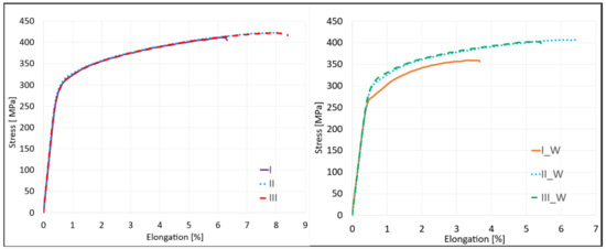 The general tendency can be associated with the amount of heat supplied in the joining process Q. In the case of samples I and I_W, the heat input coefficient was the lowest and amounted to only 3.75 (J/mm), which may indicate poor heating of the joining zone and deterioration of strength parameters. The heat input is proportional to the tool’s rotational speed and inversely proportional to the welding speed. For this reason, sets II for FSW and II_W for UWFSW obtained with a tool rotational speed of 1040 rpm and a feed speed of 143 mm/min are characterized by the most optimal heat supply of 7.27 J/mm. Samples of series III and III_W are characterized by the highest amount of heat input supplied during the welding process among the selected joints, with a value of 15 J/mm. The high rotational speed of up to 1500 rpm and the feed rate of 100 mm/min led to excessive plasticization of the material and its loss in the form of flash. The result was a reduction in the cross-section of the sample and a reduction in the strength parameters of the connection compared to sets II and II_W.