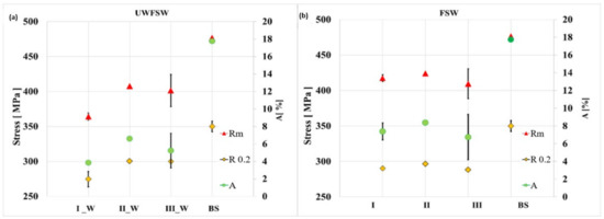 The basic mechanical properties of joints made using the proposed set of joining parameters using the UWFSW method were determined, as well as a comparison of the results obtained for the same parameters in the FSW method. A static tensile test was performed for samples joined using the FSW and UWFSW methods (