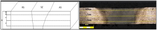 In each of the sample images, characteristic joint zones differing in microstructural structure were distinguished, and the following designations were used to describe them: NZ—nugget zone, TMAZ—thermomechanically affected zone, HAZ—heat affected zone, PM—parent material, AS—advancing side, RS—retreating side [