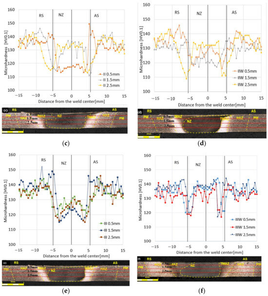 The microhardness of the base material for the (c) FSW method was approximately 140 ± 5 HV0.1. Similar microhardness values were also recorded for the (d) UWFSW method. As can be seen in the microhardness profile, the FSW and UWFSW processes did not reduce the microhardness of the base material in the entire joint, only in some of its areas. The nugget zone microhardness was in the range of 115–135 HV0.1 for samples from the UWFSW method. However, for the FSW method, the sample tested at a distance of 0.5 mm from the face differed significantly in terms of microhardness, where in the nugget zone values of approximately 113 HV0.1 were recorded, while for the remaining distances the values were at the level of 125–135 HV0.1. The greatest reduction in microhardness occurred at the border of the HAZ and TMAZ, which can be defined as the low hardness zone (LHZ). The microhardness value in this place is approximately 108 HV0.1 for the FSW method and is located 6 mm from the center of the joint on the downstream side of the RS. Depending on the parameters of the FSW and UWFSW processes, the LHZ zone may be located at the junction of the HAZ and the TMAZ. LHZ is the place where tensile cracks in joints occur. In the impressions made at distances of 1.5 mm and 2.5 mm from the face of the weld in the FSW method, there are slight changes in microhardness in the zone covering the core of the joint, while at a distance of 0.5 mm, the microhardness value decreases by approximately 20 HV0.1 compared to the previous ones. In the case of UWFSW, the highest microhardness value occurs at the level of 2.5 mm from the face, while the scatter of results is smaller and similar for all three distances. It can be noticed that the material closer to the edge of the tool blade is characterized by lower microhardness values. The most important conclusion is that the microhardness and location of the LHZ strongly depend on the set of joining process parameters used. The amount of heat input in the FSW and UWFSW processes is a decisive factor, as it can affect the extent of the joint zone areas and grain growth. Comparing variants III (e) and (f) III_W, much better microhardness values were obtained for the UWFSW method for both the NZ, RS, and AS areas. The value is at a similar level and is about 137 HV0.1. A decrease is seen only at the TMAZ site and is about 119 HV0.1. For the FSW method, the microhardness values in NZ are much lower and are about 125 HV0.1.