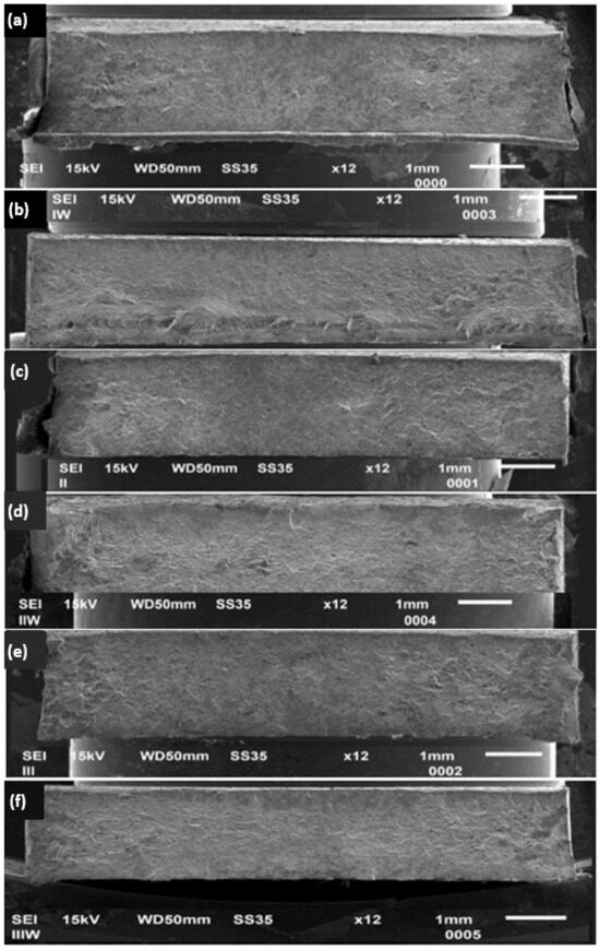 Figure 10b), we can observe a typical plastic cracking mechanism. The areas on the outer parts of the samples for both methods are the so-called pits, characterized by high surface roughness, grooves, and pores. The image variants for parameters II and II_W for both FSW and UWFSW present the characteristic source of fatigue cracking, which in these cases was located at the boundary of the zones of the thermoplastic zone and the nugget zone on the advancing side. For variant (f), the crack initiation site is located in the upper right corner of the breakthrough and is characterized by an imperfection-free, smooth surface. In contrast, for the FSW variant (e), the surface is rougher, and the cracking is more banded in nature.