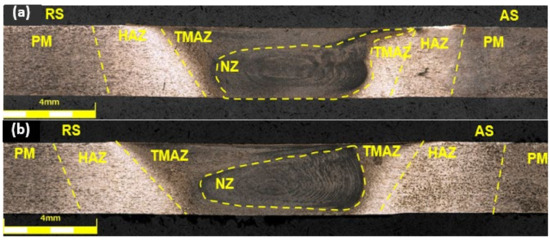 In each of the sample images, characteristic joint zones differing in microstructural structure were distinguished, and the following designations were used to describe them: NZ—nugget zone, TMAZ—thermomechanically affected zone, HAZ—heat affected zone, PM—parent material, AS—advancing side, RS—retreating side [11]. Joint (b) I_W has a visible defect in the TMAZ zone on the advancing side; this is an example of the formation of a void. The same type of defect in the microstructure also occurs in TMAZ and AS in joint (c), but its size is smaller. In other cases, the shape of the obtained nucleus is more regular for joints made using the UWFSW method. The flow of material from the nugget zone for sample (a) for the FSW method increases the probability of crack initiation during strength tests. The TMAZ zone for UWFSW connectors is more extensive, which may indicate a different temperature distribution and heat input by liquid cooling [8].