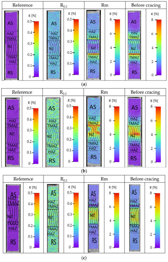 Three variants of parameters for FSW connections and, similarly, the same three sets of parameters for UWFSW connections were selected for detailed testing. Local deformation tests were carried out using digital image correlation during a static tensile test on the advancing side. The deformation results are shown in Figure 7.
