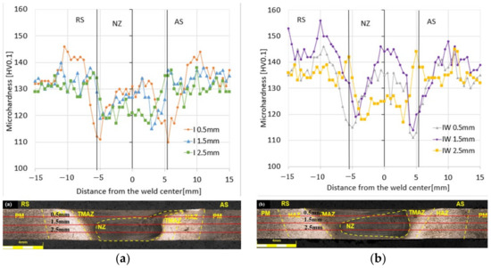 For the three variants of the parameters, the microhardness distribution was carried out in the samples with the FSW and UWFSW joints, along with a microscopic photo of the sample presented in Figure 8.