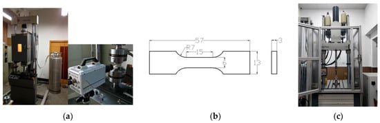 The PC/ABS composite model TC-45M (Dongguan Xinrui polymer material Technology Co., Ltd., Dongguan, China) was used in this study, and a specimen of the PC/ABS composite was designed for testing in the MTS-810 dynamic and static materials testing machine (MTS Systems Corporation, Eden Prairie, MN, USA), as shown in Figure 1a. The MTS-810 has a measured strain rate range of 10−4–10 s−1. The low and medium strain rate tensile test at various temperatures can be realized with the temperature chamber. The influence of specimen size on the force balance error should be considered in the case of high-speed drawing [20]. The specific dimensions of the specimen are shown in Figure 1b. The specimen length of 15 mm can greatly reduce the influence of specimen size on the results of high-speed tensile experiments and can be used in quasi-static experiments too [21].