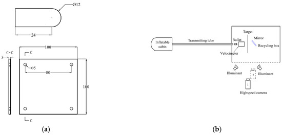 Ballistic impact test experimental design diagrams: (a) Design dimensions of target plate and bullet (unit: mm); (b) Layout of penetration test device.