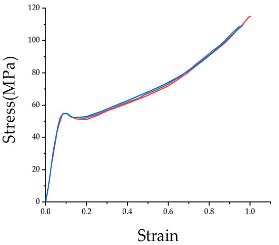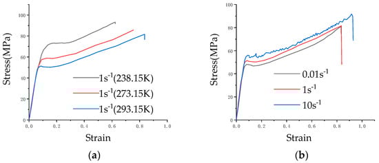 Uniaxial tensile tests were conducted on the MTS-810 testing machine at varying temperatures and strain rates. Uneven material distribution can lead to unrepeatable experimental results, so this paper performs three replications under each experimental condition to assess the homogeneity of the composite [23]. The typical results are displayed in Figure 3, which illustrates the composite’s good homogeneity. Figure 4a,b depict the results of averaging three sets of test results for different ambient temperatures at the same strain rate, as well as different strain rates at the same ambient temperature.