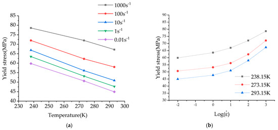 Comparison of yield stress under different experimental conditions: (a) Yield stress temperature curve; (b) Yield stress strain rate (logarithmic) curve.