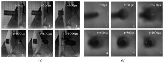 Target plate penetration experiments were conducted on the PC/ABS composite under the required experimental conditions. The high-speed impact process was recorded by a high-speed camera. For the convenience of observation, the instant of bullet impact (when the bullet was just in touch with the target plate) was defined as the start time. Figure 6 displays the experimental processes of the penetration procedure from the side and rear perspectives. It can be found that it has a large deformation and a long plastic stage during the experiment, rather than a brittle fracture. Therefore, it is found that the PC/ABS composite material is a typical ductile material by analyzing the deformation and failure mode of the target plate.