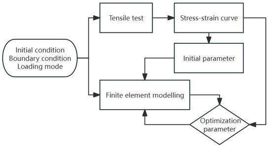 The following is the principle used in this research to determine the parameters of the J-C constitutive: The stress–strain curve transformed by the force–displacement curve at the reference temperature of 238.15 K and strain rate of 0.01 s−1 gives the values of and the stress–strain curve transformed by the various strain rates at 238.15 K gives the value of the stress–strain curve transformed by the various temperatures at 0.01 s−1 gives the value of Based on this principle, the initial parameters of the J-C constitutive are determined as . However, the parameters determined by this method have a large error and cannot accurately reproduce the failure behavior of the material [15]. The constitutive model is mainly used in the field of numerical simulation, so researchers will reproduce the experimental process by numerical simulation and modify the parameters by comparing with the results of uniaxial tensile experiment. The above parameters are put into the Abaqus 2020 to apply the same loading conditions as the test. Then, numerical simulation is compared with the tests, and the parameters are adjusted until they are in total agreement with the test. The specific process of determining the final parameters is shown in Figure 7. This method is hereafter referred to as the inversion method. The basic mechanical parameters of the PC/ABS composite are as follows: the density is 1120 kg/m3, the modulus of elasticity is 1750 MPa, Poisson’s ratio is 0.38, and the specific heat capacity is 1400 J/(kg·K). The Abaqus solver was used for numerical simulation, and the mesh type was C3D8R. After many attempts, the mesh size had no obvious influence on the simulation results.