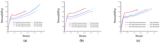 The figure shows that the mechanical properties of the PC/ABS composite are influenced by both the loading rate and ambient temperature. The temperature factor responds to these mechanical properties in a particularly noticeable way: as the ambient temperature rises, yield stress and fracture strain respectively decrease and increase. The mechanical properties’ effects are relatively weak by the strain rate at the same temperature and the mechanical properties are similar to those of traditional ductile materials [24,25].