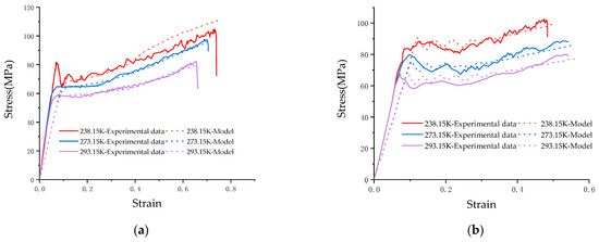 Experiments and simulations at high strain rates validate the accuracy of the constitutive model: (a) Comparison of results under different temperatures with strain rate of 100 s−1; (b) Comparison of results under different temperatures with strain rate of 1000 s−1.