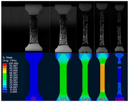 In this paper, based on the J-C constitutive constructed by the inversion method combined with the fracture strain calculated by the deformation information of the specimen. Numerical simulation was conducted to analyze the uniaxial tensile behavior of the PC/ABS composite at room temperature (293.15 K) under different strain rates. The simulation compares the process to the recording of a high-speed camera. Figure 10 displays the typical comparison results, while Figure 11 compares the force–displacement curves of the tests under different strain rates with the numerical simulations. It can be seen from the figures that the J-C constitutive determined by the inverse method and the failure parameters obtained by using DIC can reproduce the uniaxial tensile test process of the PC/ABS composite under different strain rates at room temperature.