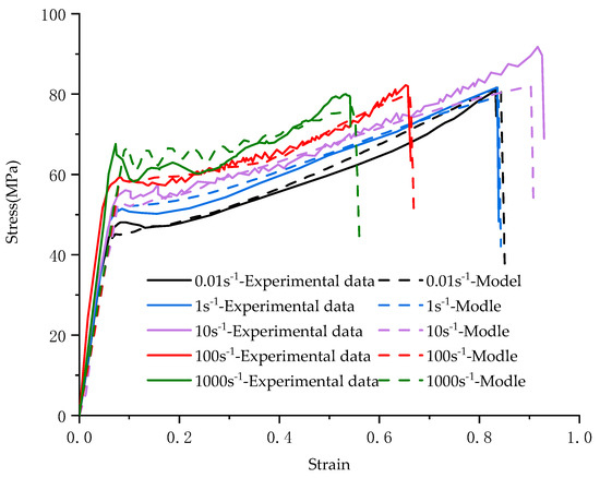 Through the above inversion method, J-C constitutive parameters are determined and shown in Table 2. A comparison between numerical and experimental results is shown in Figure 8, and it should be pointed out that there is no failure criterion, so there is no steep drop in the numerical simulation curve. At this time, the deformation process can be basically reproduced at low and medium strain rates.