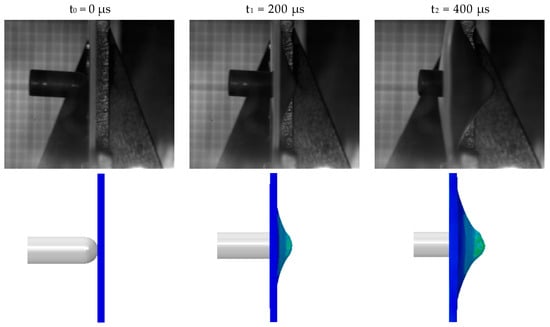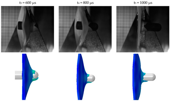 Figure 12 shows the simulation results of the finite-element simulation of the PC/ABS composite for the penetration experiment, as well as a comparison to the experimental process of penetrating the target plate. Time (t0 = 0 μs) was defined as the moment the bullet began contact with the target plate. Then, we compared the simulation with the target plate’s damage shape and the bullet’s location at each of the following times: t0 = 0 μs, t1 = 200 μs, t2 = 400 μs, t3 = 600 μs, t4 = 800 μs, and t5 = 1000 μs. The results of the finite-element simulation were found to be in good agreement with the experimental results. The finite-element simulation’s damage shape and experimentally reclaimed target plate were compared, as shown in Figure 13. The finite-element simulation results can be accepted given the intricacy of the experimental procedure, the target plate fixation error, and several irresistible factors like air pressure instability, bullet ejection deviation, etc., [38]. In conclusion, the failure fracture strain computed by the deformation information of the specimen and the J-C constitutive parameters of the PC/ABS composite established using the inversion method are both accurate in this paper.