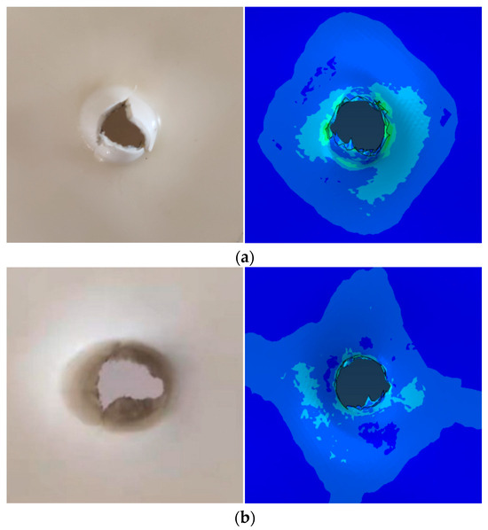 Comparison between the failure shape of the target recovered in the penetration experiment and the simulation results: (a) Comparison between the experiment on the back of the target and the simulation results; (b) Comparison of simulation results of the frontal experiment of the target plate.
