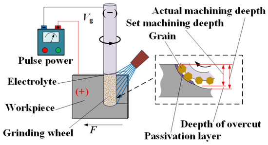 Electrochemical grinding (ECG) is a hybrid machining process in which mechanical grinding and electrochemical anode dissolution act simultaneously to remove the material [9,10]. Figure 1 illustrates the principle of the ECG process. A metal-bonded grinding wheel connected to the negative pole of the power is rotated clockwise at a peripheral speed of Vg, and the workpiece connected to the positive pole of the power is simultaneously fed to the right side at a feed rate of Vw. A depth of cut, Δ, is given between the grinding wheel and the workpiece. When the electrolyte is supplied to the machining area between the grinding wheel and the workpiece, the surface material of the workpiece is electrochemically dissolved, and then a thin passive film that hinders the continued progress of the electrochemical anode dissolution is formed on the work surface in the machining area. The weakened thin passive film is easily removed by the abrasive grains, which move along with the peripheral surface of the rotating grinding wheel, and then the electrochemical anode dissolution will continue. With the circulation of electrochemical anode dissolution, a passive film is formed and removed by the abrasive grains, and the surface material of the workpiece is continuously removed until the processing requirements are met. In the process of ECG, the contribution of mechanical and electrochemical energy fields in material removal can be regulated by adjusting parameters, such as the applied voltage and the feed rate. Therefore, the process of ECG can obtain a bigger material removal rate (MRR) than mechanical grinding (MG) and be more precise than electrochemical machining (ECM) [11,12]; it is an ideal technology for the efficient–precise machining of difficult-to-machine materials that are easy to passivate.