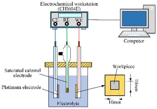 Passivating electrolytes, such as the NaNO3 aqueous solution, are generally used in the ECG process as they can effectively control the stray electrolysis and, consequently, improve the machining precision [9,23,24]. In the present study, a NaNO3 aqueous solution was used, and the passivation properties of the Ti–6Al–4V workpiece in the NaNO3 aqueous solution of different concentrations were tested by an electrochemical workstation (CHI604E, CH Instruments, Shanghai, China) and an electrochemical cell to select an ideal electrolyte. A schematic diagram of the test system is shown in Figure 2. It is a three-electrode test system, which is mainly composed of an electrochemical workstation, an electrochemical cell, and a computer. A platinum sheet (20 × 20 × 0.2 mm), a saturated calomel electrode (SCE), and a workpiece acted as the counter electrode (CE), the reference electrode (RE), and the working electrode (WE), respectively. The surface of the workpiece is parallel to the counter electrode, and only 1 cm2 of the surface was not covered with insulation. The electrolytes used in the test were NaNO3 aqueous solutions of different concentrations at a temperature of 25 °C. Before the test, the surfaces of the workpieces were ground and polished to the mirror surface and ultrasonically cleaned using deionized water.