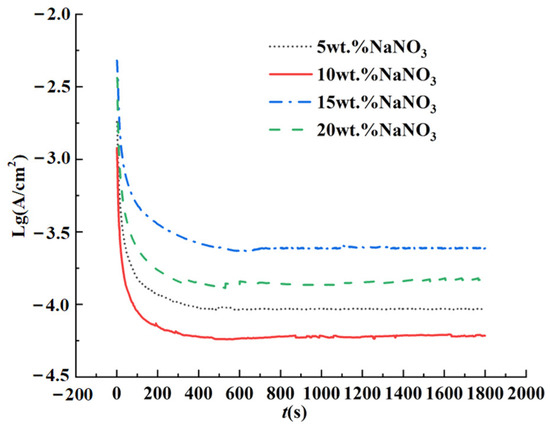 Liu et al. [24] tested the polarization curves for titanium alloy Ti–6Al–4V in a 10 wt.% NaNO3 aqueous solution. The three-electrode test system was utilized and found that the passivation potential was in the range of 0.5–11 V. In the constant potential polarization test of Ti–6Al–4V, a voltage of 8 V in the passivation potential range was selected as the passivation potential, and the constant potential polarization curves were tested in NaNO3 aqueous solutions of 5 wt.%, 10 wt.%, 15 wt.%, and 20 wt.%, respectively, and the tests lasted 1800 s. Figure 3 shows the test result; it is a variation of current levels as functions of time in NaNO3 aqueous solutions of different concentrations at a passivation potential of 8 V.