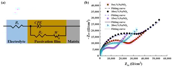 EIS analyses of the passivated Ti–6Al–4V in NaNO3 aqueous solutions of different concentrations: (a) fitting results; (b) the EEC model for the fitting of EIS data.