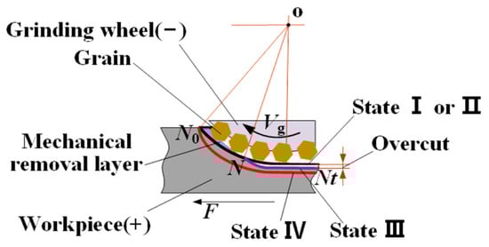 The MRR matching between the electrochemical action and the mechanical grinding is of great importance for the efficiency and precision of ECG [15,27,28,29,30]. According to the magnitude of the applied voltage and the feed rate of the workpiece, four process states can be identified in ECG [31], as shown in Figure 5. In state I, the applied voltage (U) is in the range 0 < U < ΔE, where ΔE is the sum of the electrode potentials and over-potentials, no electrochemical dissolution is possible, and total mechanical removal occurs. In state II, the applied voltage is in the range ΔE < U, but it is insufficient to generate electrochemical anode dissolution and there will be no overcut occurring, the passive film formed on the surface of the workpiece assists the mechanical abrasive action, and total mechanical removal still occurs. As the applied voltage increases to a critical value, mechanical abrasion occurs towards the leading portion of the tool/workpiece interelectrode gap (N-N0), yet there is only electrochemical anode dissolution and overcut taking place directly under the center of the wheel (N-Nt), and this defines state III. While the applied voltage is further increased and the feed rate of the workpiece (Vw) is decreased to a critical value, total electrochemical anode dissolution with no mechanical assistance occurs, and overcut takes place in the whole interelectrode gap (N-Nt); this defines state IV. Therefore, in terms of overcut, state II belongs to a precise ECG process, and state III and state IV belong to efficient ECG processes.