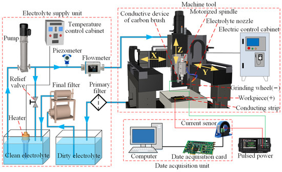 Figure 6 shows a schematic drawing of the ECG system that was used to conduct the ECG process. The electrochemical grinding system consisted of an electrolyte supply unit, a machining machine, a data acquisition unit, and pulsed power. The measured repetitive positioning resolution of the machining machine was around 1 μm, which was smaller than the wheel depth of cut in the present study (see Table 3). The maximum speed of the motorized spindle (BMS-4020, NAKANISHI, Tokyo, Japan) was 20,000 rpm, and its rotation resolution was less than 1 μm. On the end of the spindle, a claviform metal bond electroplated CBN grinding wheel was installed. An electrolyte nozzle was employed to supply the electrolyte fluid into the machining area. A Ti–6Al–4V workpiece (16 × 16 × 3 mm) was held on the worktable of the machine tool via a work holder, which was made of nonconductive marble. Pulsed power was employed to induce the electrochemical reaction between the electrodes. The anode output of the pulsed power was directly connected to a conducting strip of the workpiece, and the cathode output was connected to the shank of the grinding wheel through a conductive device composed of an insulating plate, a hollow bolt, a spring, and a carbon brush.