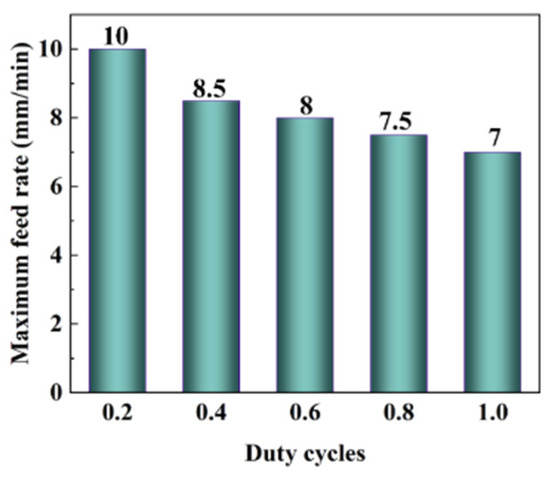 The maximum feed rate was defined as the maximum value of the feed rate at which no spark discharge occurs during the machining process for 5 min. Experimental parameters in Table 4 in this study were adopted in the tests to explore the maximum feed rate at different duty cycles. Each test began with a low feed rate, which was then gradually increased in increments of 0.5 mm/min until reaching the maximum feed rate [34]. The test result is shown in Figure 7. It can be seen from the result that with the increase in the duty cycle, the maximum feed rate decreases gradually; the reason is that the bigger the duty cycle is, the longer the voltage is applied, and the greater the possibility of spark discharge in the machining gap is [14], nothing except reducing the feed rate can be performed to increase the interelectrode gap to prevent spark discharge.