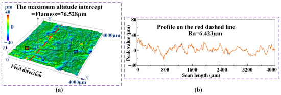 In order to calculate the MRR in the efficient ECG stage, ultrasonic cleaning and weighing of the workpieces were conducted before and after each processing. The experiments at each duty cycle were repeated three times to ensure repeatability. The average value of the three calculated MRRs was taken as the experimental MRR at each duty cycle. A laser confocal microscope (OLS5100-SAF, Olympus, Tokyo, Japan) was used to test the contour of the machined surfaces and measure the flatness and roughness of the surfaces. The measuring method of the flatness and roughness is shown in Figure 9. the maximum altitude intercept, which was obtained by the analysis application of the laser confocal microscope (OLS5100-SAF, Olympus, Tokyo, Japan), was selected as the flatness of the measured surface. Red dashed lines, as shown in Figure 9a, were selected on the contour of the machined surfaces randomly to measure the roughness of the machined surfaces. The flatness and roughness were measured for the three machined surfaces at each duty cycle. the average values of the three measured results were taken as the experimental flatness and roughness of the specimens at each duty cycle. Figure 9b shows the measured flatness and roughness of the machined surface at the duty cycle of 0.6.