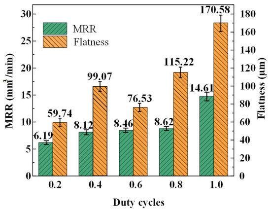 The average values and their error bars of flatness and MRR measure results of the machined surfaces at different duty cycles are shown in Figure 10. It can be seen from the result that with the increase in the duty cycle, the MRR shows an increasing trend; however, while the duty cycle increases from 0.4 to 0.8, the MRR increases very slowly. For flatness, as the duty cycle increases, flatness increases from 59.74 μm to 170.58 μm; however, at a duty cycle of 0.6, flatness suddenly decreases to 76.53 μm. This result indicates again that the precision of the ECG process applying a high current density can be obviously improved by reducing the duty cycle. Therefore, the matching of the electrochemical action and the mechanical grinding is better at a duty cycle of 0.6 compared to other duty cycles. In order to obtain a machined surface with a relatively small flatness to shorten the time utilized for the subsequent finishing, 0.6 was selected as the optimal duty cycle of the efficient ECG stage, and a relatively high MRR of 8.46 mm3/min was obtained.