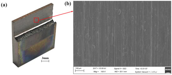 In the present study, a granularity of 89–104 μm was selected for the claviform metal bond electroplated CBN grinding wheel, and the average protruding height of the CBN abrasive grains was in the range of 40–50 μm. In order to obtain a low surface roughness in the precise ECG stage, a smaller wheel depth of cut, a higher grinding speed, and a larger feed rate compared to the efficient ECG stage should be applied. Previous studies have shown that the dissolution potential of Ti–6Al–4V in a 10 wt.% NaNO3 aqueous solution is approximately 12 V [24], and a low DC voltage that was lower than 12 V should be applied in the precise ECG stage. Optimization of the process parameters was implemented experimentally to improve the processing precision of the machined surface. Experimental parameters in Table 5 were applied to conduct the precise ECG stage for the machined surface of the efficient ECG stage because of smaller damage to the machined surface slighter tool wear and lower surface roughness according to optimized experiments, which were not described in the present study. After the efficient ECG stage was carried out by layers several times, the ECG stage was conducted by layers four times without changing the grinding wheel. A precise thin-walled structure of Ti–6Al–4V was obtained, as shown in Figure 11a, and Figure 11b shows the micro-morphologies of the machined surfaces observed by SEM.