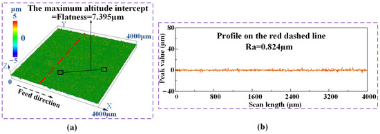 The same measuring method used in the efficient ECG stage was adopted to measure the flatness and roughness of the machined surfaces obtained by the precise ECG stage. Figure 12a shows the contour and the measured flatness of the machined surfaces, and Figure 12b shows the measured roughness of the machined surface. A flatness of 7.395 μm and a roughness of Ra 0.824 μm were obtained by the proposed E-P-C-ECG process for Ti–6Al–4V. This result of surface roughness is close to that obtained by M. Nomura et al. [16,17], who conducted a hybrid material removal process named Ultrasonic-assisted Electrochemical Grinding (UAECG) of Ti–6Al–4V, applying a cylindrical grinding wheel with a diameter of 1.8 mm; however, the grinding depth (5 μm) and grinding width (2.5 mm) they applied are much less than that were applied in the present study, and the MRR they obtained was much lower than that obtained in the present study.