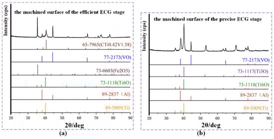 A rotating target X-ray diffractometer (XRD, SmartLab, Japan) was used to test the element composition of the machined surfaces. Figure 14a,b show the processing of X-ray spectra obtained from the surfaces machined by the efficient and the precise ECG stage, respectively. It can be seen in Figure 14a that the machined surface of the efficient ECG stage expatiated characteristic peaks at 35.5°, 40.7°, 53.6°, and 63.9°, which were attributed to (100), (101), (102), and (110) of CTi0.42V1.58 (PDF 65-7965), and the results flesh out that carbides of the matrix metal elements were detected on the machined surface of the efficient ECG stage. A reasonable interpretation is that the carbide skeleton in the Ti–6Al–4V alloy is difficult to dissolve under the action of electrochemicals and is easy to adhere to the machined surface; therefore, a large number of carbides will aggregate and be detected on the surface machined by the efficient ECG stage in which the electrochemical anodic dissolution is dominant. Applying a similar analysis method, the following results can be obtained. Oxides of the matrix metal elements and the matrix metal elements were detected on the machined surface of the efficient ECG stage and the precise ECG stage. The test results reveal that, in the efficient ECG stage, some residual electrolytic products of the Ti–6Al–4V in NaNO3 aqueous solution at high applied voltage were attached to the machined surface, and the chemical composition of the residual electrolytic products are carbides and oxides. There are simultaneously carbides, oxides, and individual elements of the matrix metal elements on the machined surface of the efficient ECG stage, which further indicate the serious non-uniform corrosion due to the extreme passivation of Ti–6Al–4V and the oxidation of the NO3− ion. In the precise ECG stage, the electrolytic products generated in the previous process were removed layer-by-layer by the mechanical grinding of the abrasive grains. There were oxides of the matrix metal elements on the machined surface because there was no anodic dissolution except for anodic passivation in the machining area at a low applied voltage, and, consequently, there was no stray corrosion.