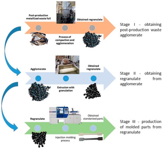 Post-industrial waste films were produced by pouring a liquid polymer through a slotted head onto a calendar roll (cast films). The metallized films that were recycled were post-production waste. The polymer re-granulate was produced from the obtained cast films in the next few steps. This re-granulate was used to produce standardized moldings for further testing.