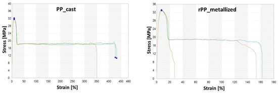 The mechanical properties determined during the tangential tensile test do not differ significantly (the difference was 1.15 MPa, which is 3.62%). However, significant differences were recorded for the strain values. The impurities contained in the rPP_metallized samples significantly reduced the strain obtained during the test (rPP_metallized samples are characterized by a 71% lower strain value).