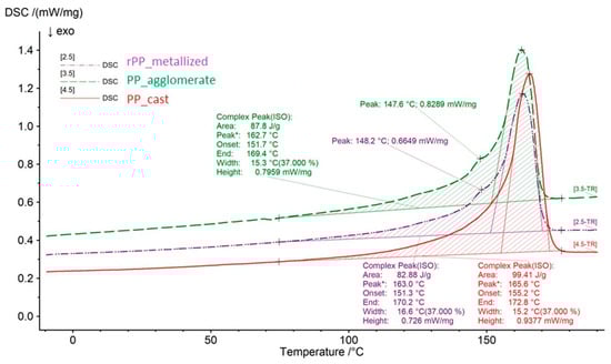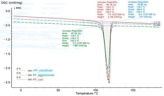 The analysis of the thermal properties included the following three measurements: for the PP_cast granulate, for the re-granulate obtained from the metallized film (rPP_metallized), and for the agglomerate of this film as an intermediate material.