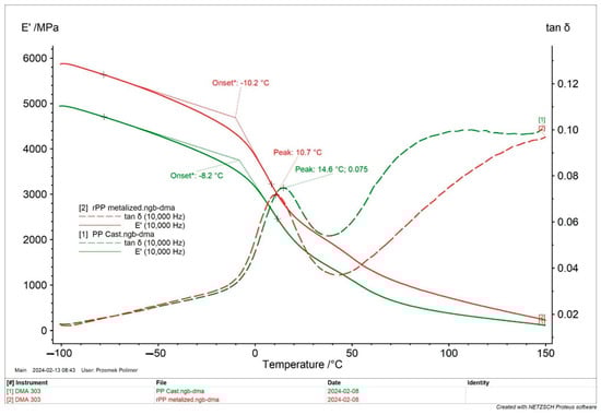 Significant differences are visible in the changes in the storage modulus E’ as a function of temperature changes, which persist throughout the entire temperature range. The samples made from the rPP recyclate-containing metal had E’ values 1.000 MPa higher at −100 °C than the samples made from the virgin PP_cast material. The reason for this may be the content of impurities, residuals of metallization, and remnants of materials that were fragmented during recycling processes and which constituted a phase in the mass of the molded parts that caused slight strengthening. The glass transition temperature values read from the E’ and tan δ curves are similar for both tested materials. In the case of the E’ curves, the difference is 2K, while in the case of the extreme tan δ, a higher value was achieved by the sample made of the primary PP_cast material. The extreme values of the mechanical loss coefficients tan δ for both samples are similar, but they differ significantly after exceeding the glass transition temperature range. The rPP sample loses its damping properties, which corresponds to a much lower tan δ value, while the PP_cast sample, after exceeding 40 °C, shows a significant increase in this parameter, which then remains at the level of approximately 0.1 in the rest of the test temperature range of 100–150 °C.