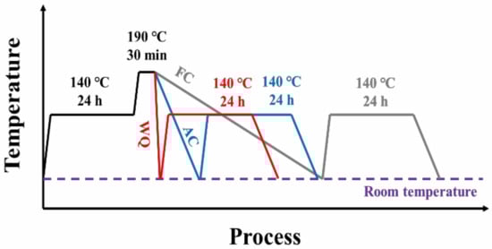 The experimental Al-Zn-Mg-Cu alloy was supplied by Fujian Xiangxin Co., Ltd. (Fuzhou, China), which underwent casting at 710 °C, homogenization (475 °C, 24 h), and scalping to 150 mm in diameter. The nominal chemical composition range is presented in Table 1. The samples were subjected to solution treatment at 475 °C for 1 h in an air furnace, followed by immediate water quenching and subsequent RRA treatments. After retrogression treatment, samples were cooled in three different ways: water quenching (WQ), air cooling (AC), and furnace cooling (FC). Details of RRA treatments are shown in Figure 1 and Table 2. The cooling rates of WQ, AC, and FC are over 600 °C/s, 10~15 °C/min, and 1~2 °C/min, respectively.