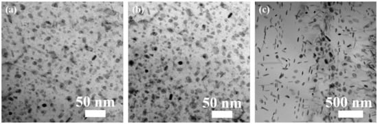 BF images of precipitates within the grain along [110]Al in samples after RRA treatments with different retrogression cooling ways: (a) WQ, (b) AC, and (c) FC.