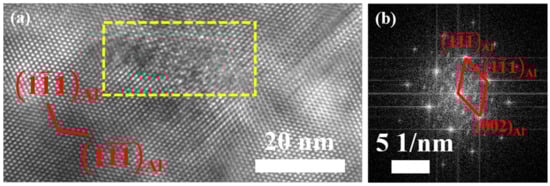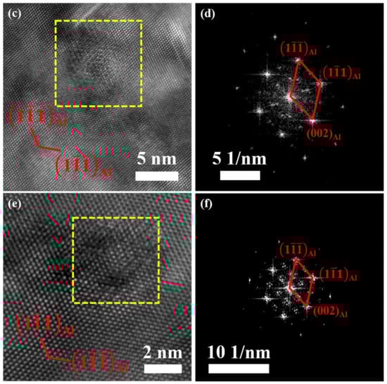 Further investigations were conducted to identify plate-like and round-shaped phases. Figure 3a,b present the HRTEM image of the plate-like phase observed in the [110]Al direction, along with the corresponding fast Fourier transform (FFT) pattern. The plate-like phase resides on the habit plane of (111)Al and its diffraction spots are located at 1/3 and 2/3 [220]Al, demonstrating the same characteristic of the η’ phase as reported in previous literature [39,40]. Moreover, the orientation relationship between the Al matrix and η’ phase can be identified as [110]Al//[]η’. Additionally, some of the round-shape precipitates also exhibit the characteristics of the η’ phase, as shown in Figure 3c,d. As shown in Figure 3e,f, the morphology of the sphere phase in the HRTEM image and the corresponding FFT pattern align well with the characteristics of the T’ phase [41,42,43]. Previous studies have confirmed that the η’ phase exhibits a round shape (face-on) and plate-like (edge-on) [44,45,46] when viewed from [110]Al axes. The projection of the T’ phase maintains a nearly round shape regardless of the zone axis being viewed due to its globular morphology [47,48].
